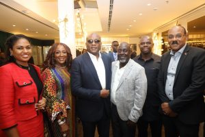 L-R: Maria Browne, wife of the Antiguan Prime Minister; Alice Onyema, Vice Chairman, Air Peace; Dr Allen Onyema, Chairman, Air Peace; Antigua and Barbuda Ambassador to Nigeria, Amb. Davin Joseph; Dr Ebuka Okafor, Chairman, Vixa Pharmaceuticals Ltd; and Honourable Gaston Browne, Prime Minister of Antigua and Barbuda at a Business Forum in Lagos to discuss investment opportunities in Antigua and Barbuda. Photo: Suleiman Amagbor