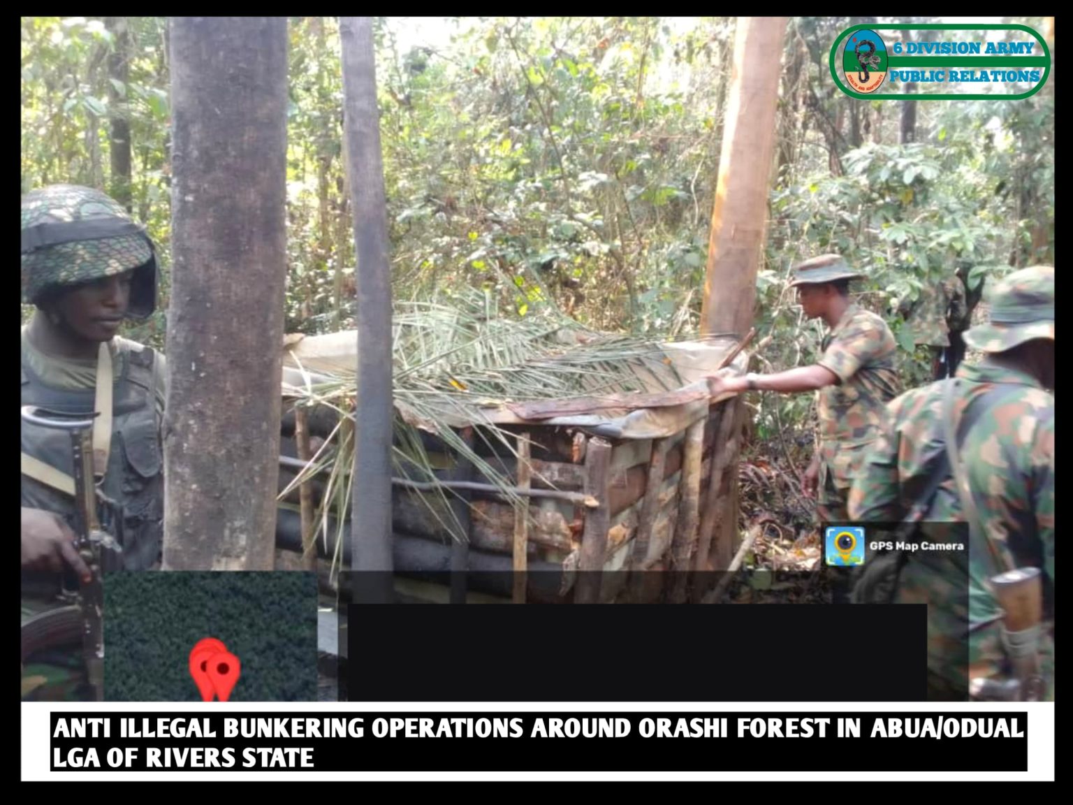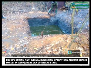 “In Rivers State, at Ogale Community in Eleme LGA, troops discovered 350 sacks filled with over 10,500 litres of stolen crude. Around Okarki Forest in Ahoada West LGA, troops destroyed two illegal refining sites, with sacks and a reservoir filled with over 3,000 litres of stolen crude recovered. A similar operation was conducted at Orashi Forest in Abua/Odual LGA, where troops traced a long hose which spanned over 9 kilometres, leading to four illegal refining sites, comprising four large ovens with a capacity of 30,000 litres each, receivers and dugout pits stocked with over 7,000 litres of crude oil.