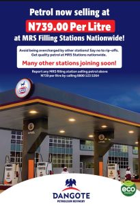 “We encourage Nigerians to avoid buying PMS at excessively high prices when they can access locally refined fuel at ₦739 per litre from over 2,000 MRS stations nationwide. Report any MRS station selling above ₦739 per litre by calling 0800 123 5264,” the refinery said.