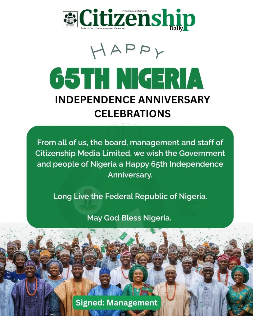 A statement on Wednesday (today) signed by Saidu Abubakar, PhD, the General Manager, Administration, of the Citizenship Media group said at 65, Nigeria deserves to take its rightful place at the world stage by mobilising citizens to be on the same page with government on matters of development and nationhood.