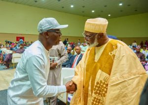 From left: Ondo State Governor and candidate of the All Progressives Congress, APC in the November 16 governorship election, Hon Lucky Orimisan Aiyedatiwa Lucky exchanging pleasantries with Chairman, National Peace Committee and Former Head of State, General Abdulasalam Abubakar (rtd), at the signing of the Ondo Peace Accord by all Political Parties and Governorship candidates ahead of the 2024 gubernatorial election, held at the International Culture and Events Centre (The DOME) in Akure today